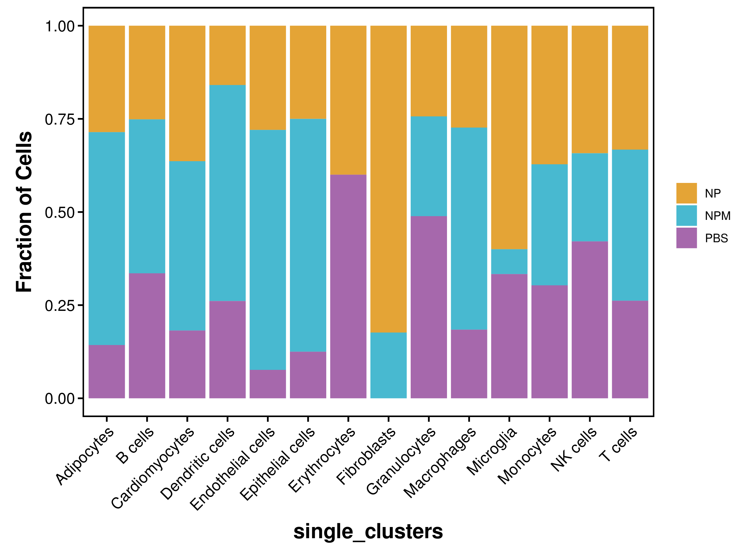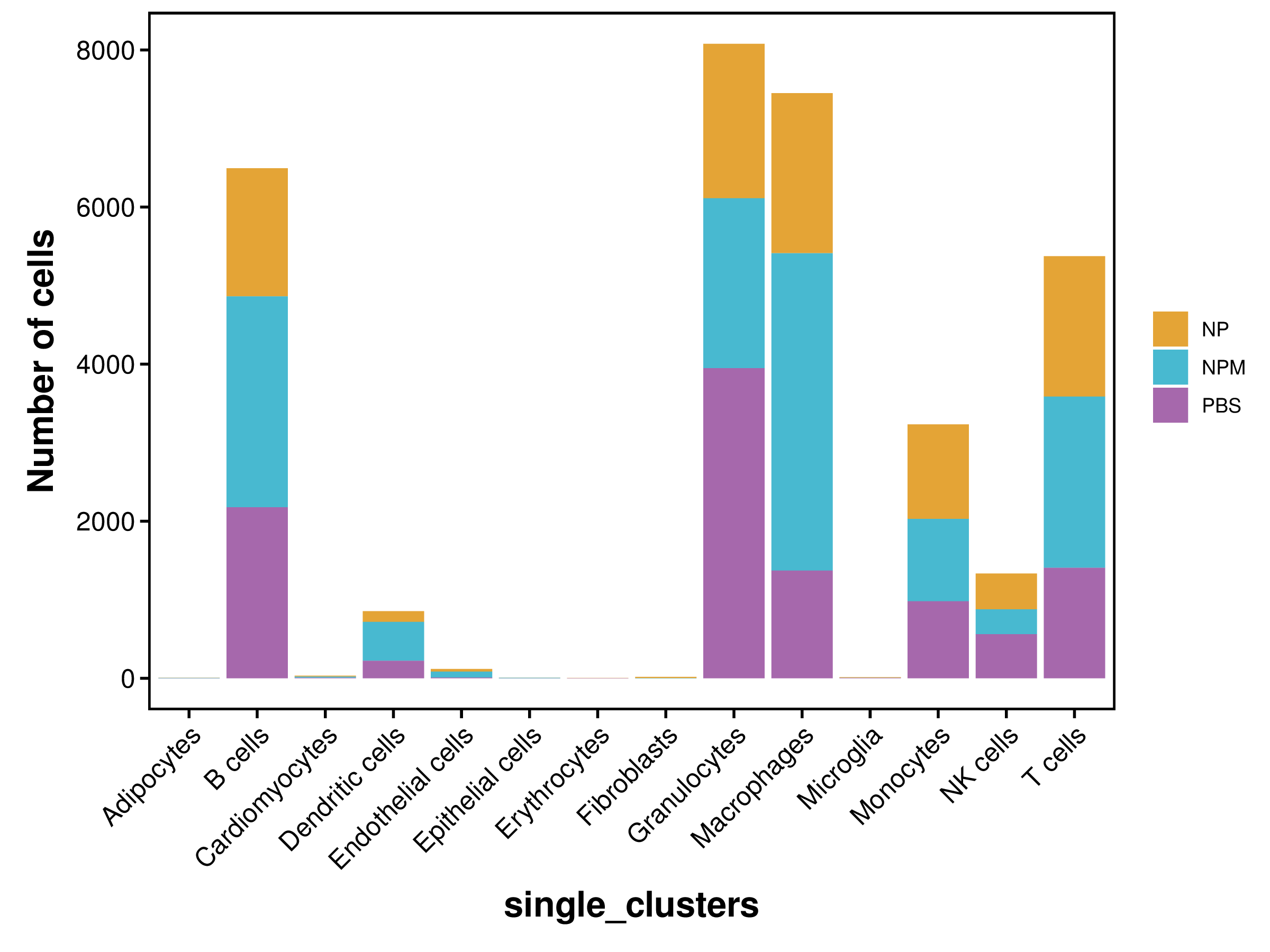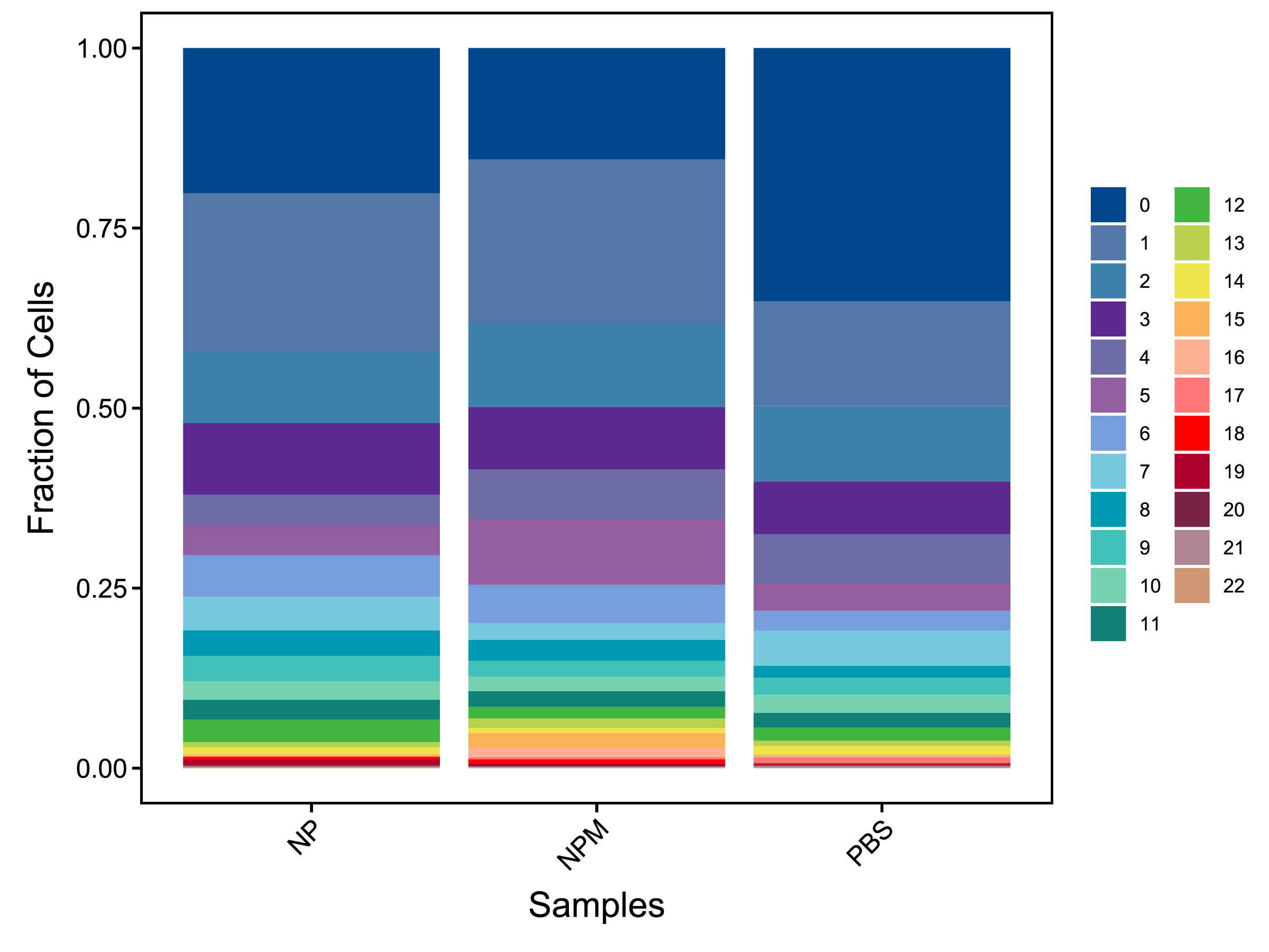 | Fig 4-2-1 各样本中各亚群细胞数量堆叠图 | Fig 4-2-2 各样本中各亚群细胞数量百分比堆叠图 | |