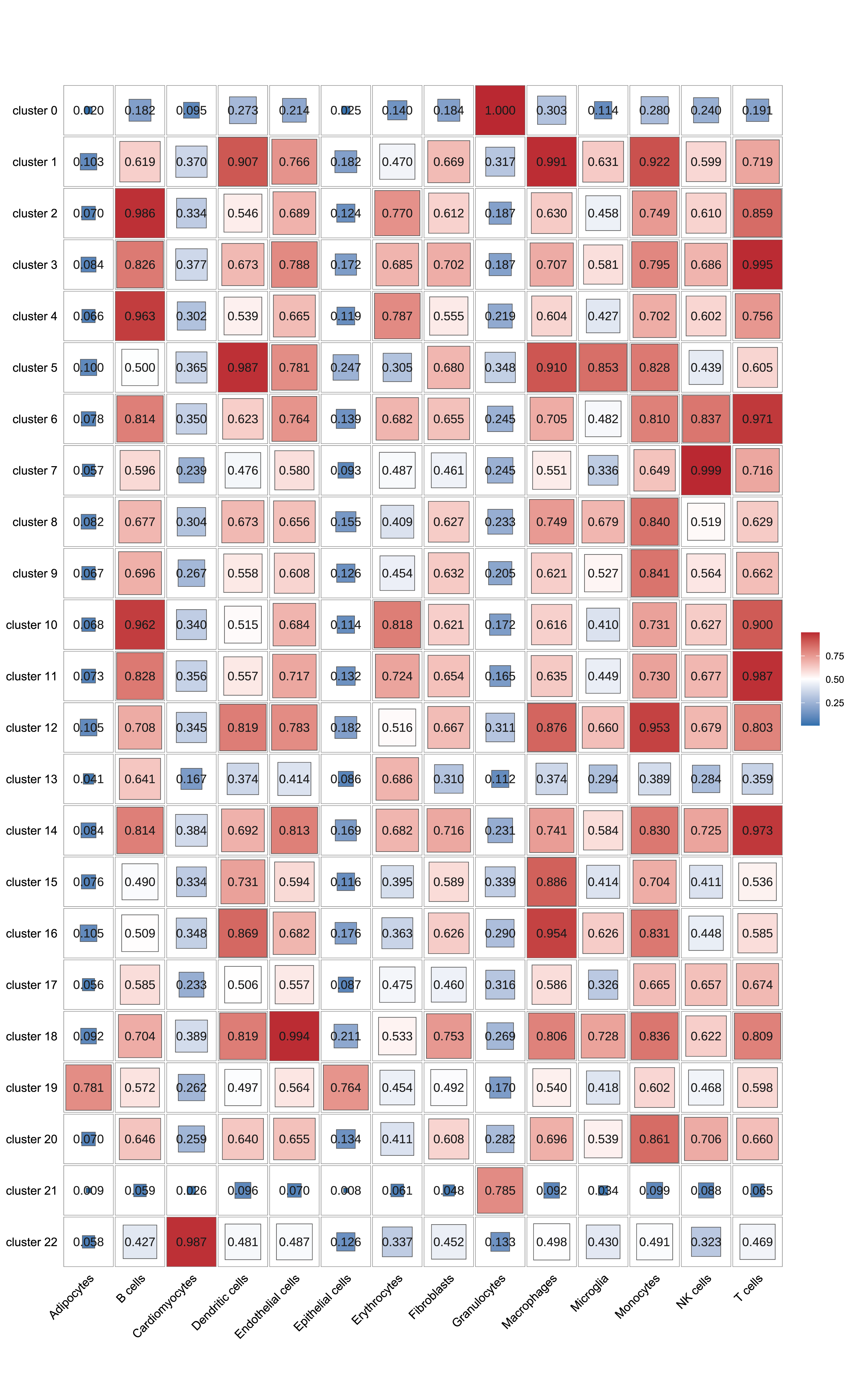 进一步,我们计算两个细胞亚群之间相关性并绘制成热图。图中具有高度相关性的两个细胞亚群具有比较相似的基因表达模式,可能是同一种细胞类型。这张相关性热图为人工细胞亚群鉴定提供了一定的指导作用。
