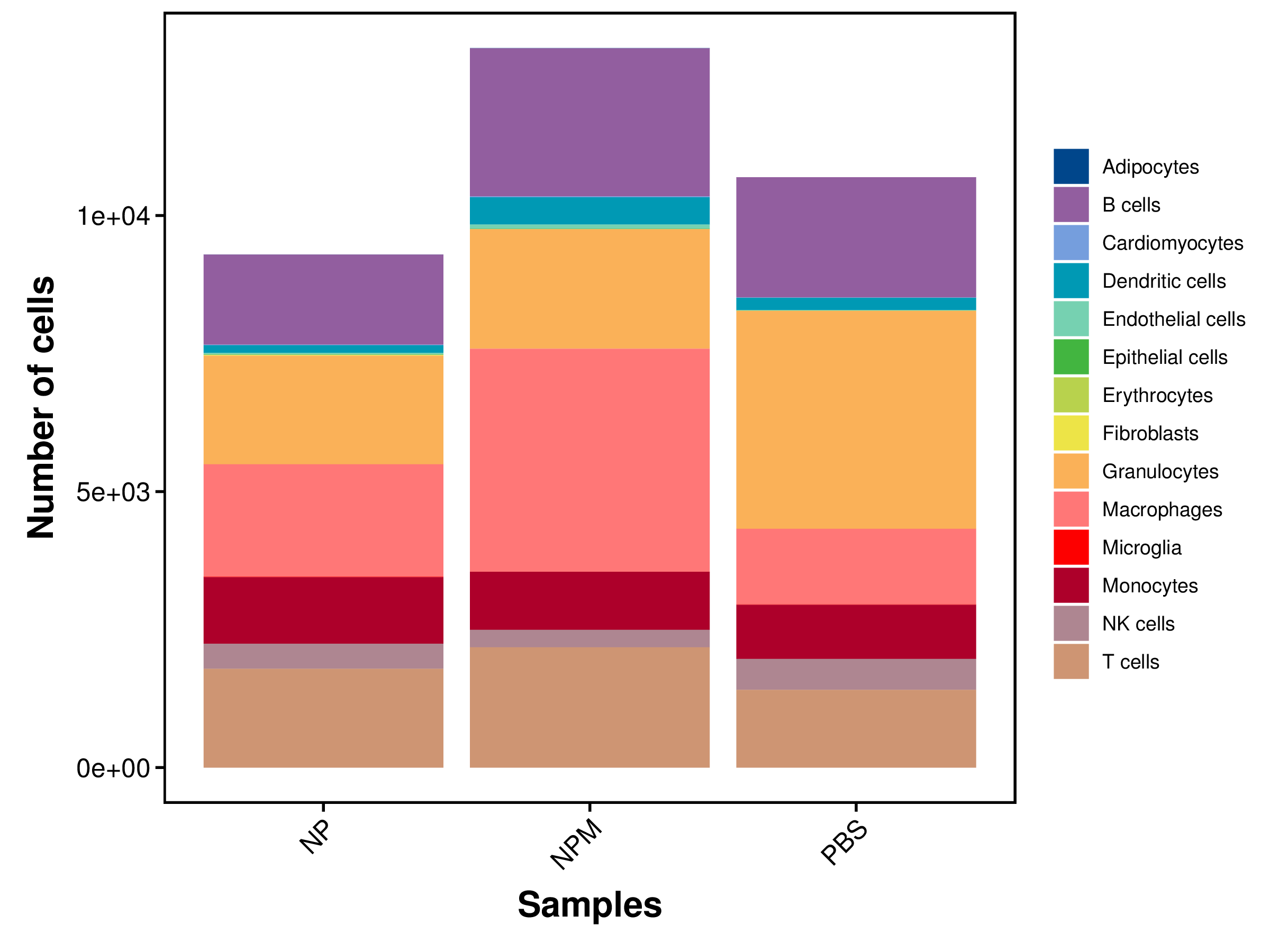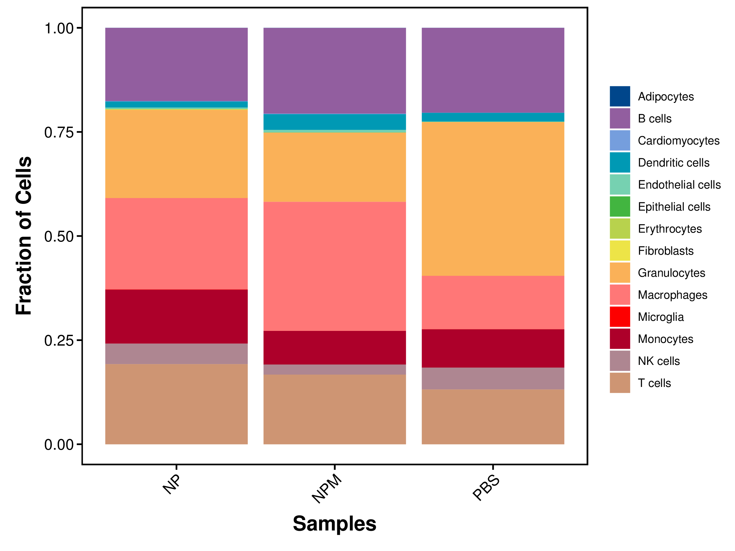 | Fig 4-4-1 各样本中各细胞类型细胞数量堆叠图 | Fig 4-4-2 各样本中各细胞类型细胞数量百分比堆叠图 | |