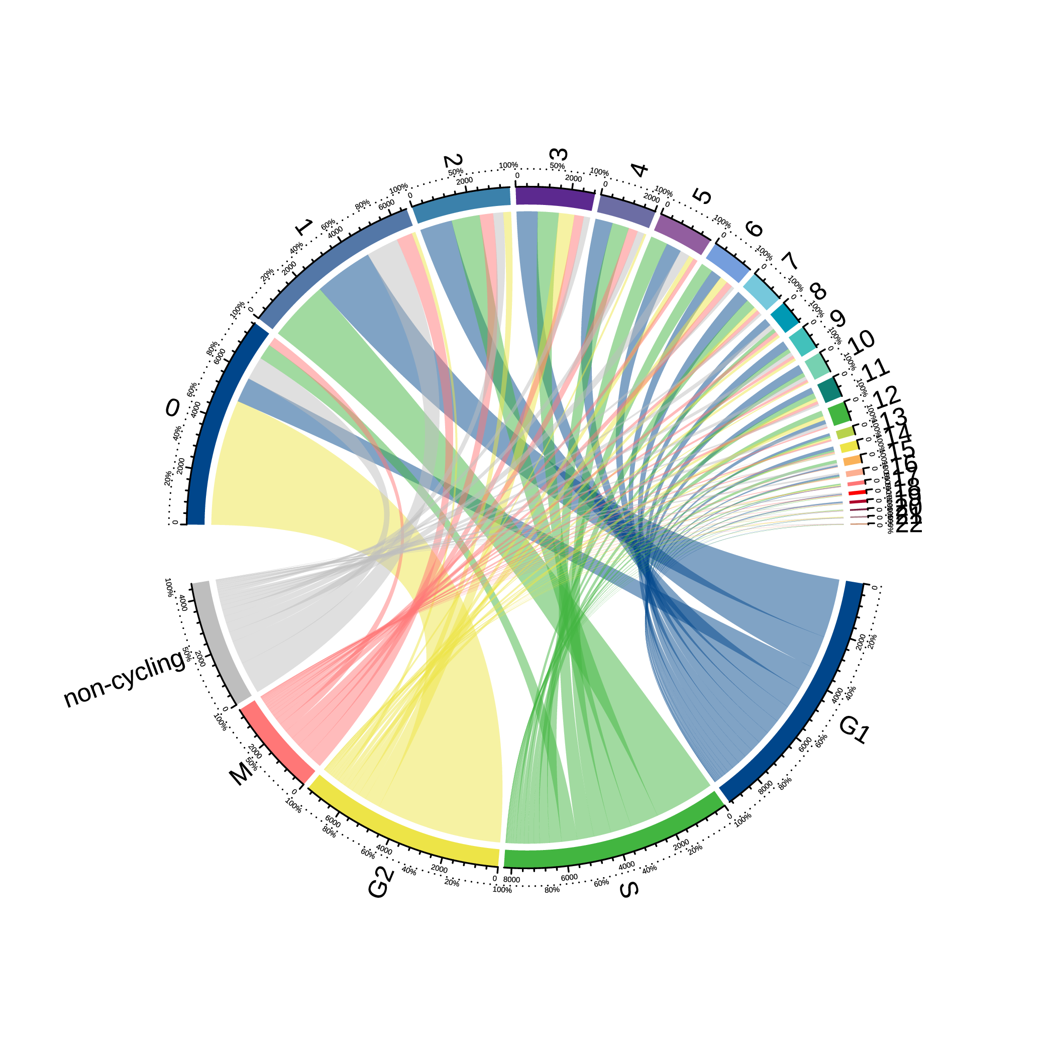 | Fig 9-2-4 Seurat分群与细胞周期推断对应circos图 |
