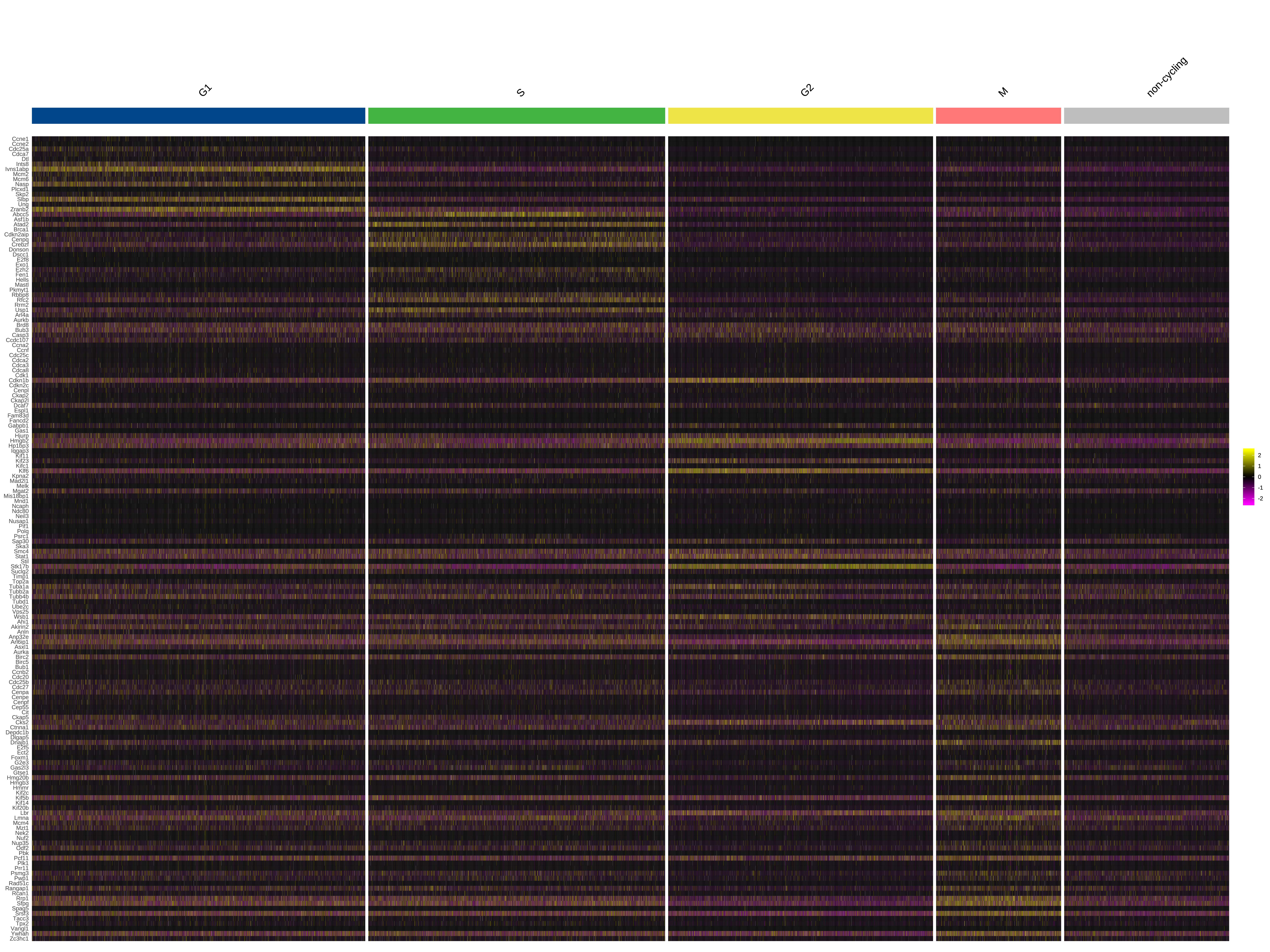 热图可以同时展示大量基因在每个细胞中的表达量及其在细胞群体中的分布情况。使用热图展示周期蛋白基因在不同细胞周期的表达量,可以看到各时期特征蛋白基因相对集中表达在对应的时期中,是对细胞周期推断结果准确性的验证。