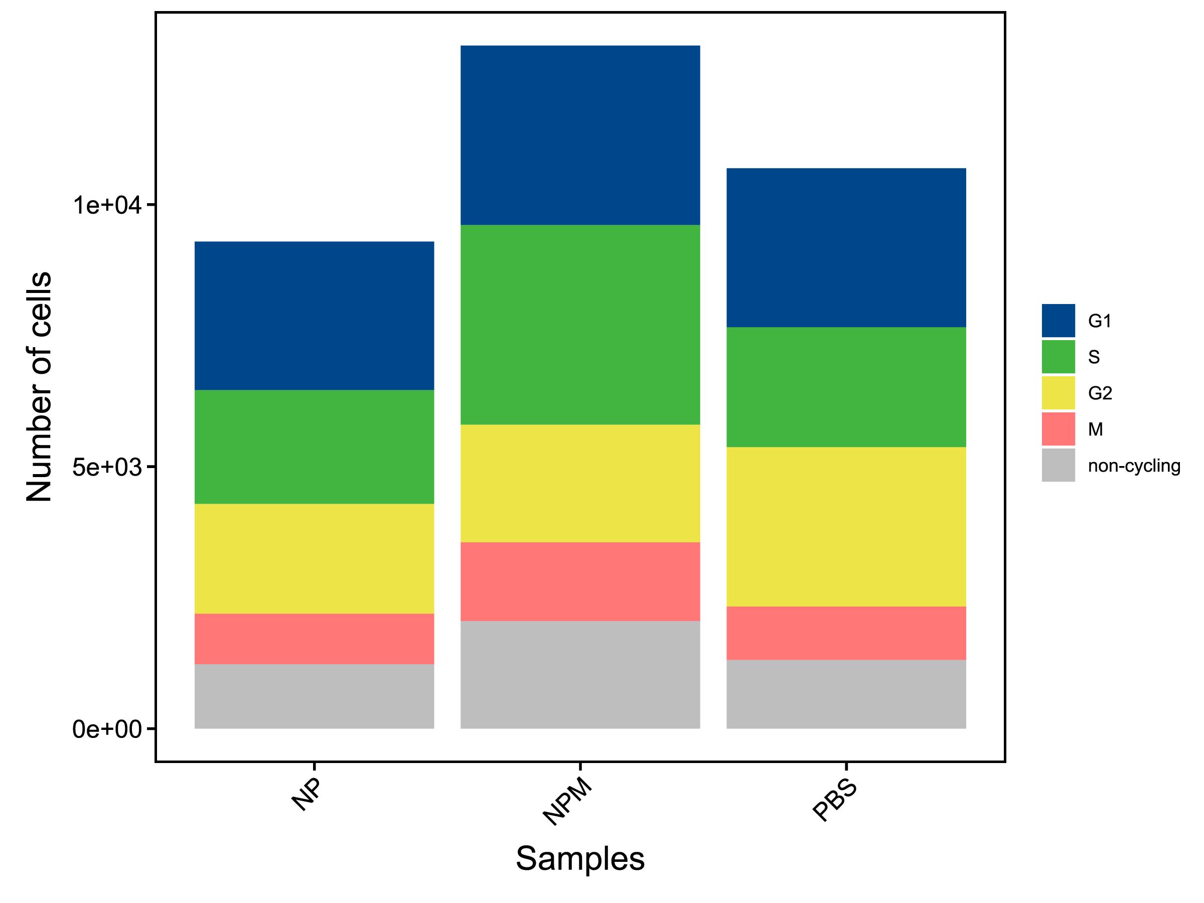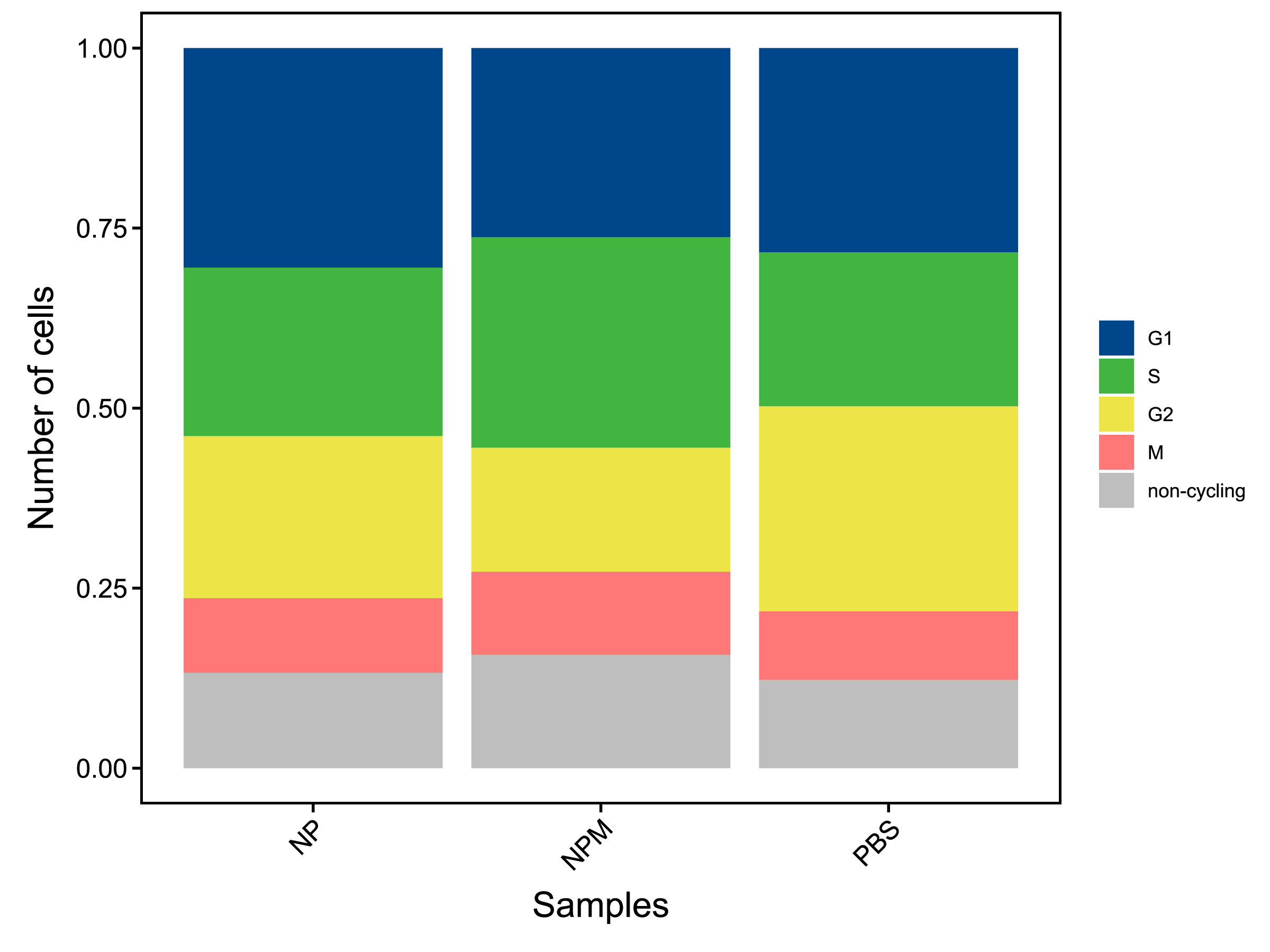 | Fig 9-2-1 不同样本的不同细胞周期细胞的数量堆叠图 | Fig 9-2-2 不同样本的不同细胞周期细胞的数量比例堆叠图 | |