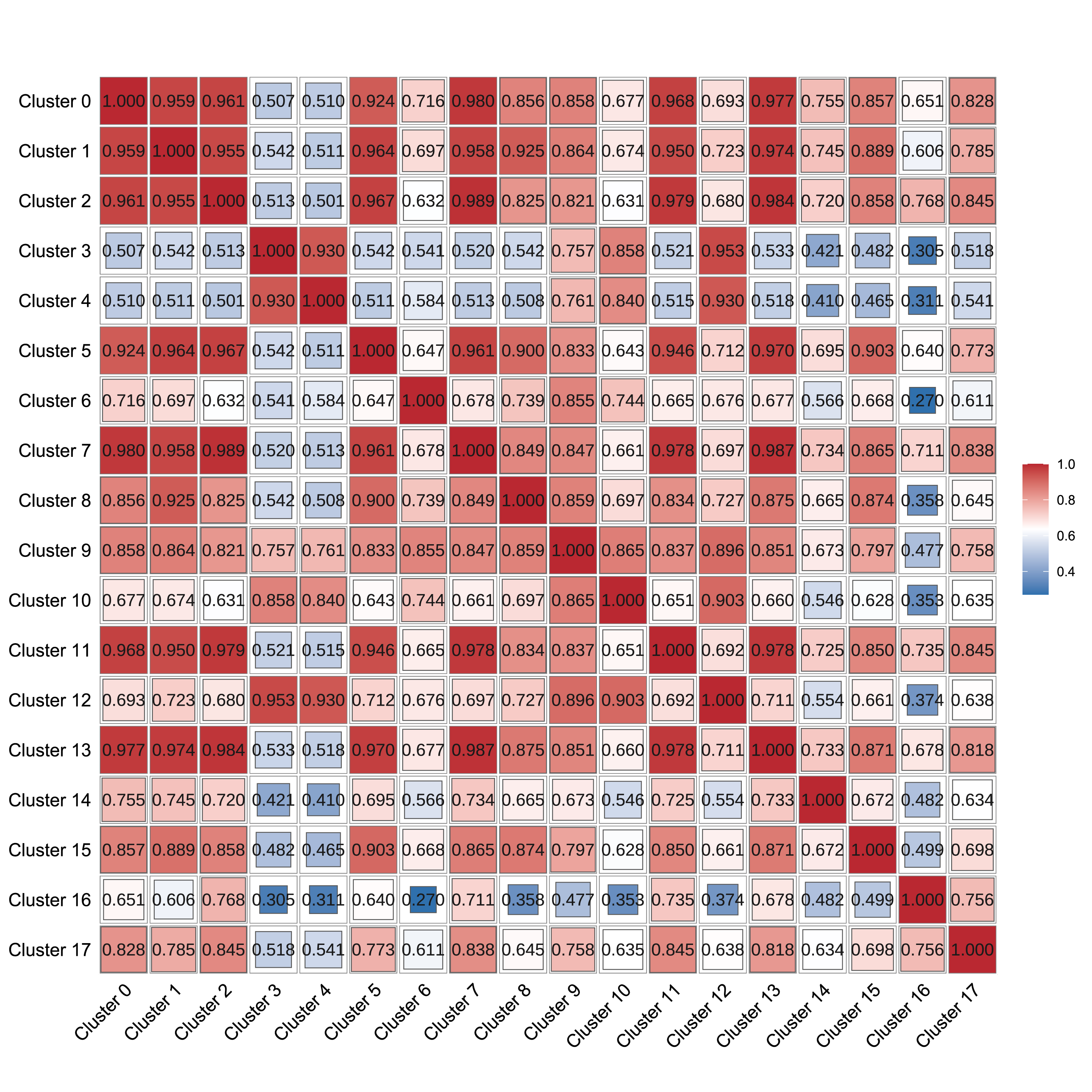 进一步,我们计算两个细胞亚群之间相关性并绘制成热图。图中具有高度相关性的两个细胞亚群具有比较相似的基因表达模式,可能是同一种细胞类型。这张相关性热图为人工细胞亚群鉴定提供了一定的指导作用。