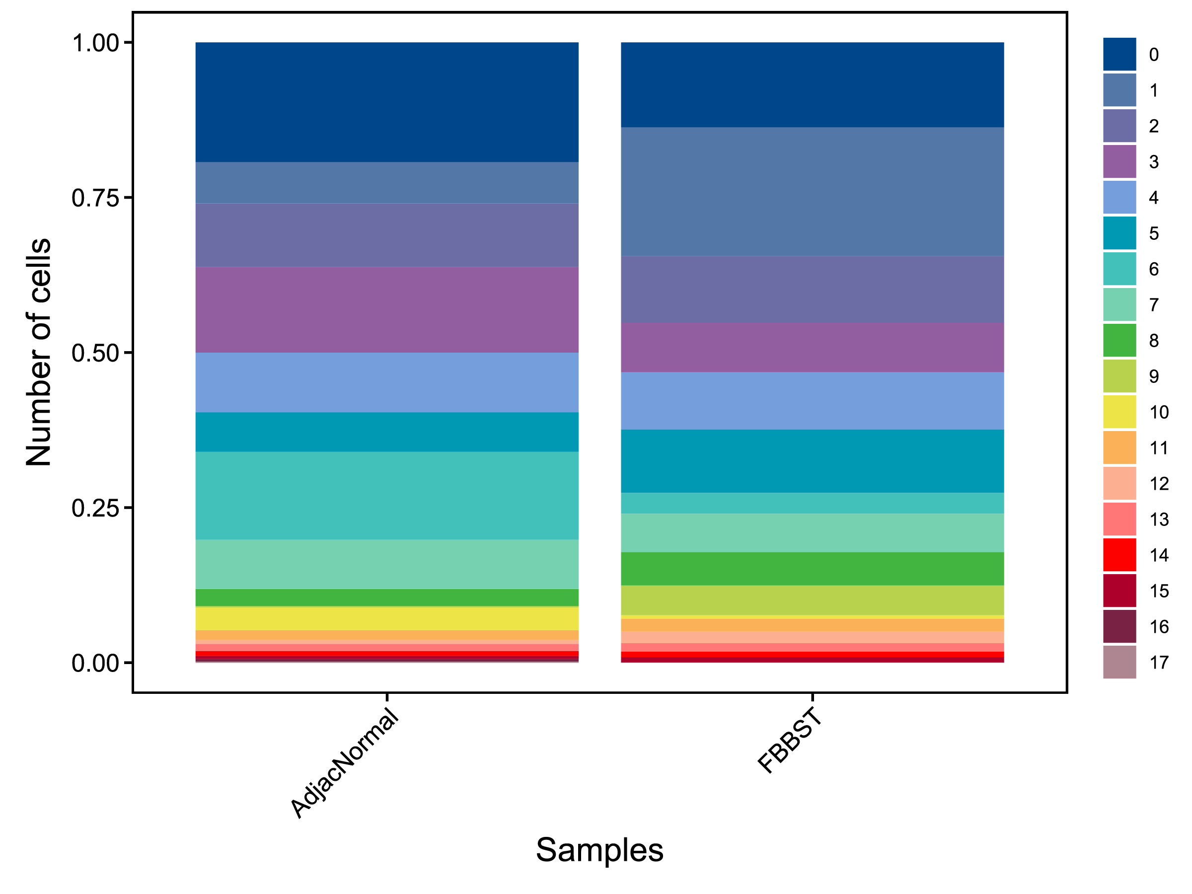| Fig 4-2-1 各样本中各亚群细胞数量堆叠图 | Fig 4-2-2 各样本中各亚群细胞数量百分比堆叠图 | |