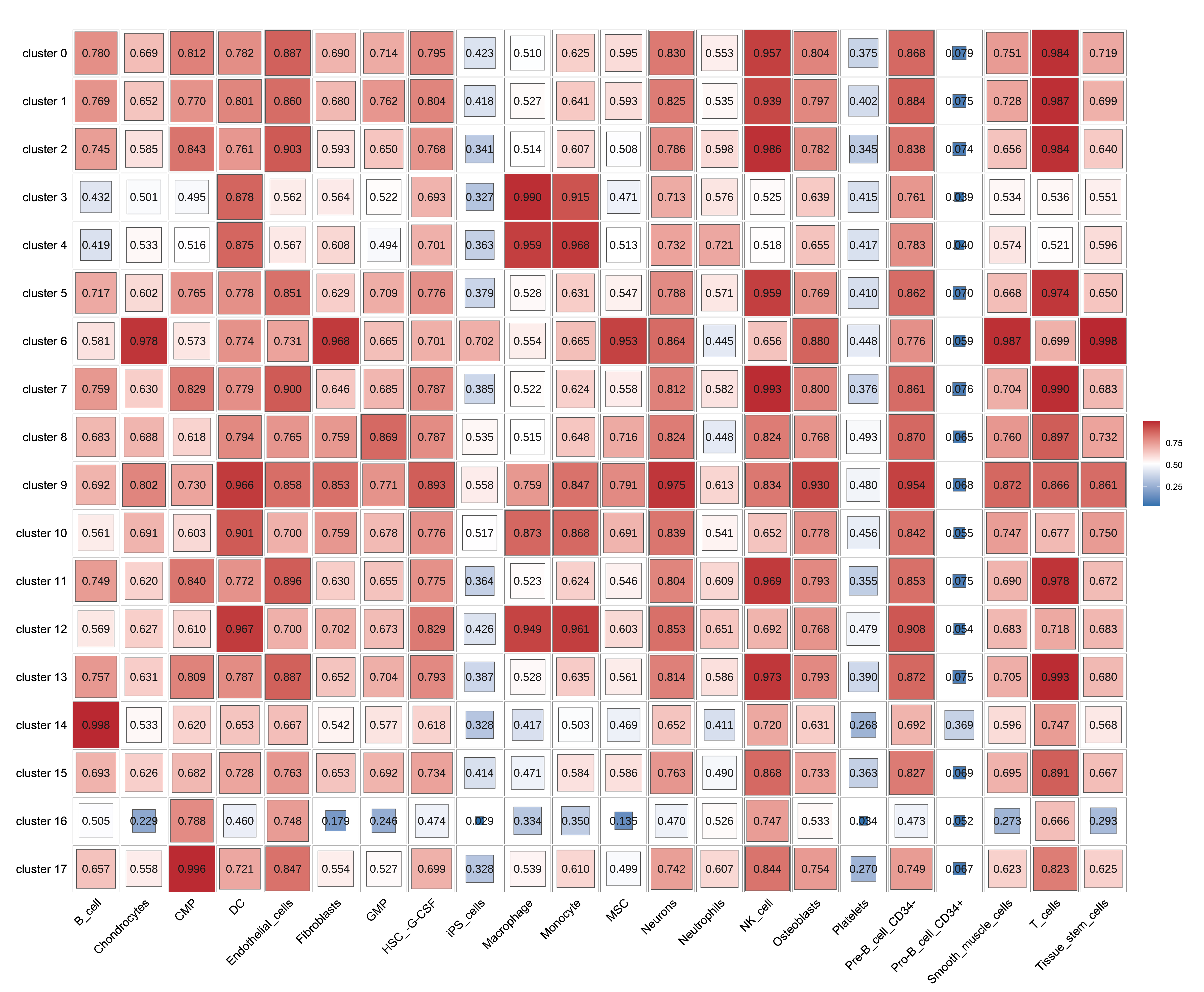 通过singleR,我们可以鉴定细胞的细胞类型;通过Seurat,我们可以得到细胞的聚类信息。通过这两个软件,我们可以将一组细胞按照细胞类型和细胞分群两种方式进行聚类。然后,我们计算各个细胞亚群的细胞与各个细胞类型的细胞之间的相关性,并绘制成热图,作为singleR细胞鉴定结果准确性的一个佐证。