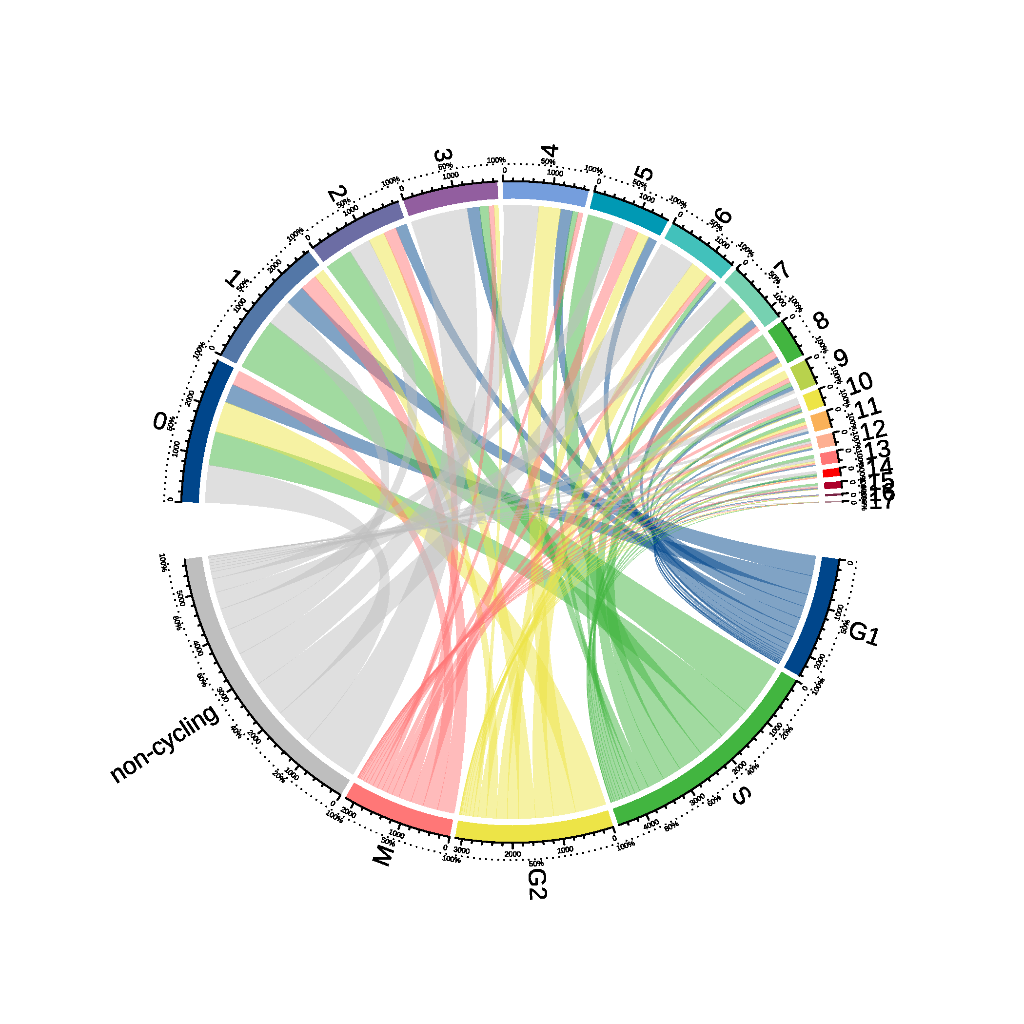 | Fig 9-2-4 Seurat分群与细胞周期推断对应circos图 |