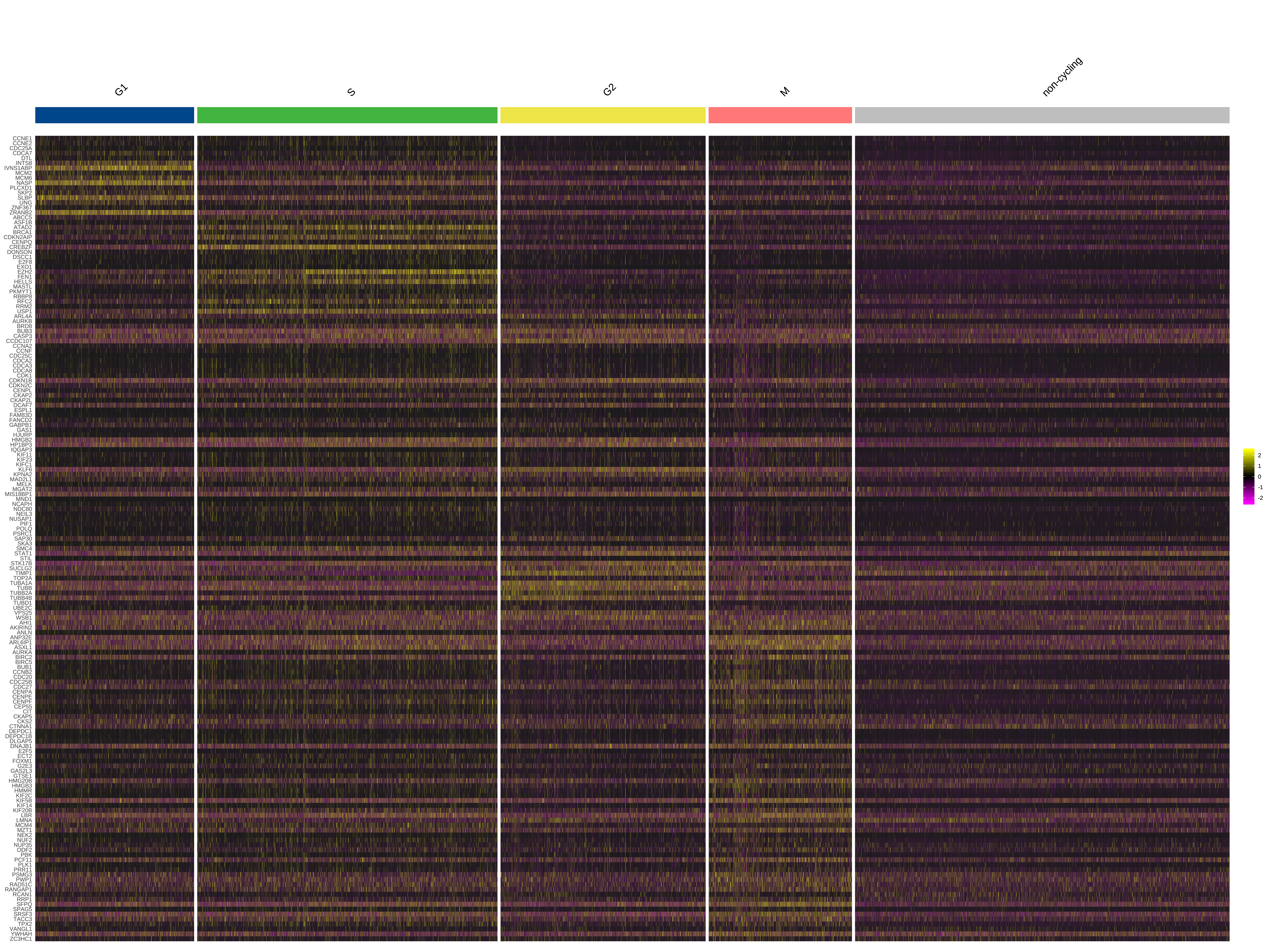热图可以同时展示大量基因在每个细胞中的表达量及其在细胞群体中的分布情况。使用热图展示周期蛋白基因在不同细胞周期的表达量,可以看到各时期特征蛋白基因相对集中表达在对应的时期中,是对细胞周期推断结果准确性的验证。