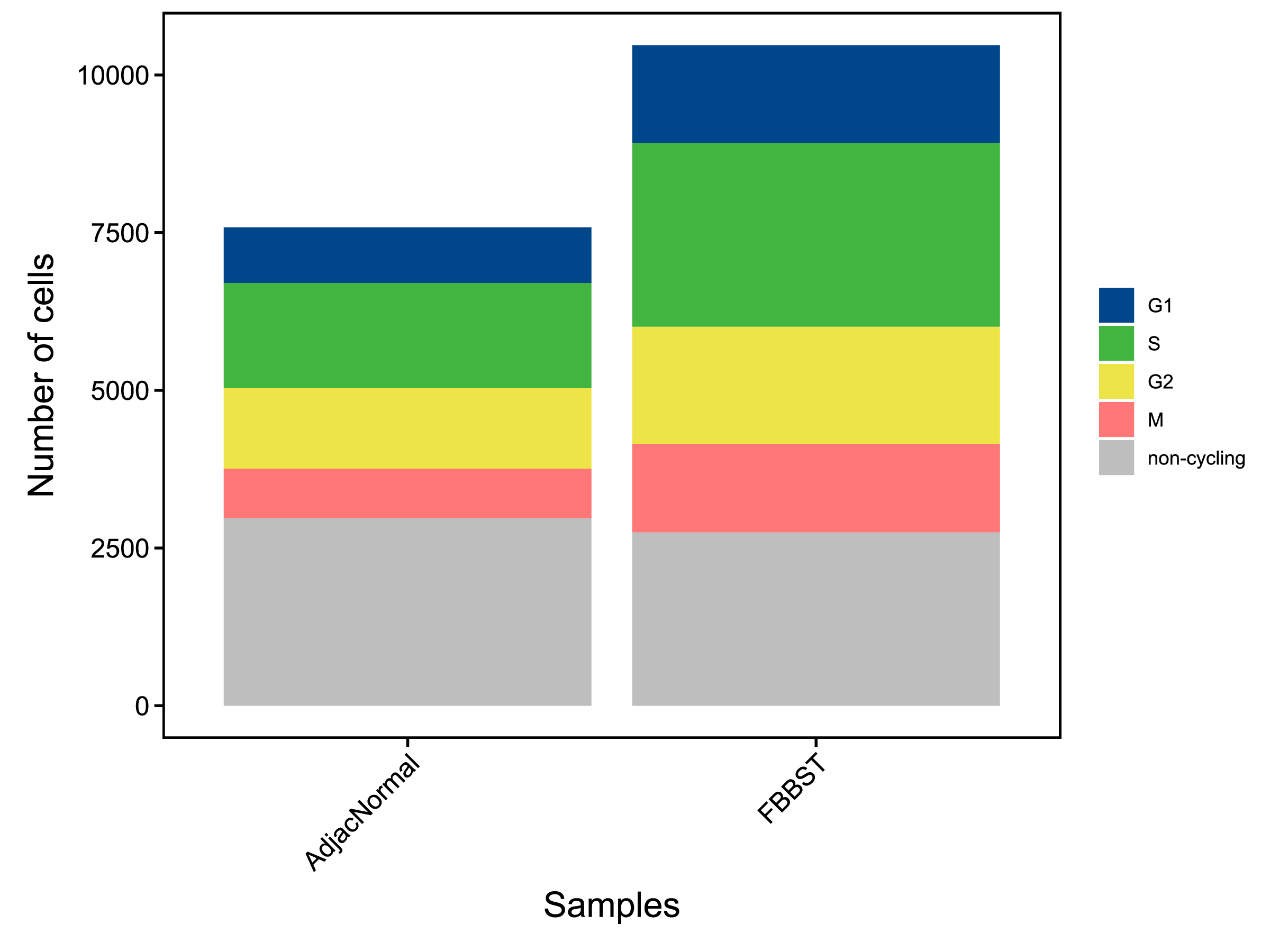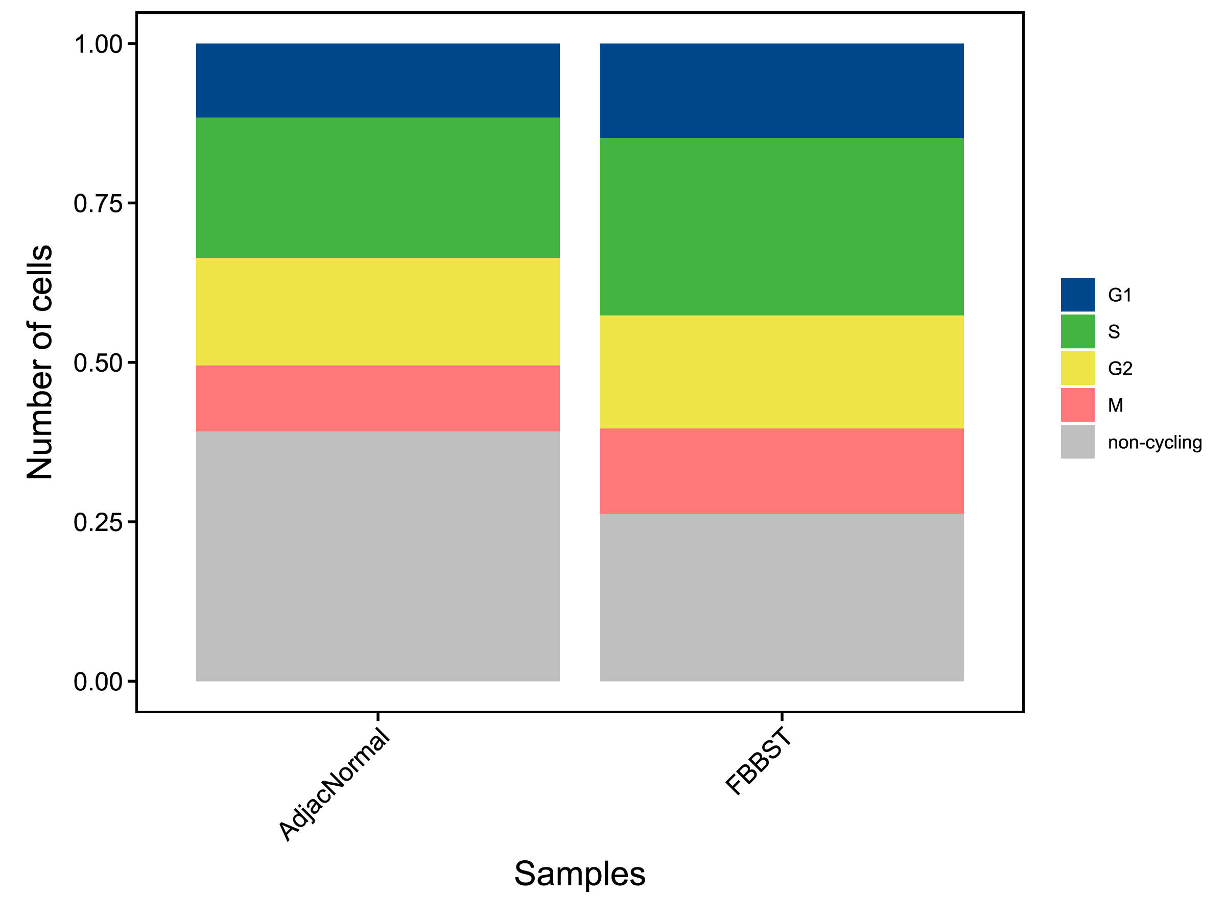 | Fig 9-2-1 不同样本的不同细胞周期细胞的数量堆叠图 | Fig 9-2-2 不同样本的不同细胞周期细胞的数量比例堆叠图 | |